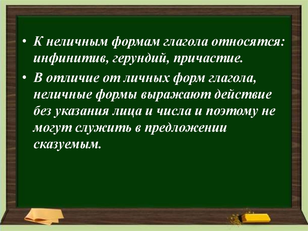 • К неличным формам глагола относятся:инфинитив, герундий, причастие.