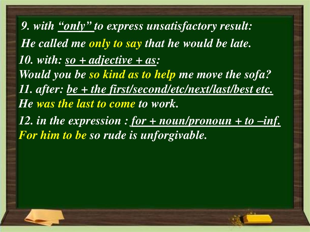 9. with “only” to express unsatisfactory result:He called me only to say that he would be late.