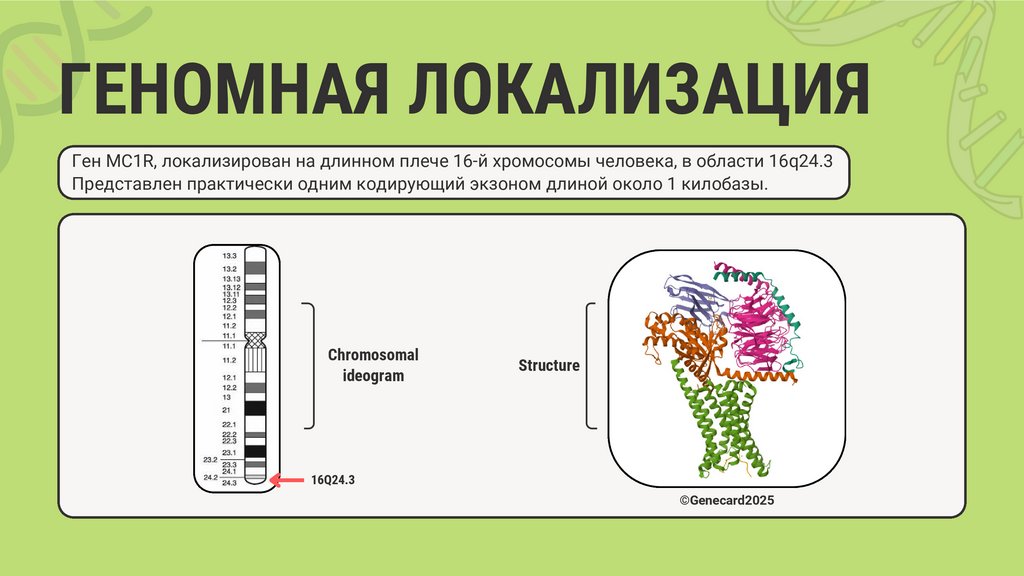 ГЕНОМНАЯ ЛОКАЛИЗАЦИЯГен MC1R, локализирован на длинном плече 16-й хромосомы человека, в области 16q24.3