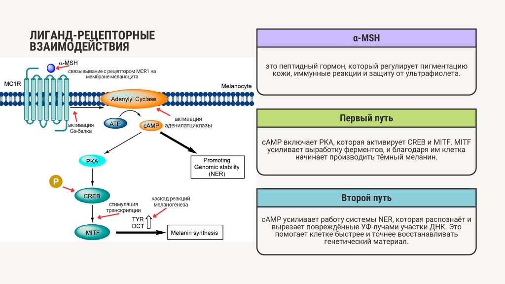 cAMP включает PKA, которая активирует CREB и MITF. MITF