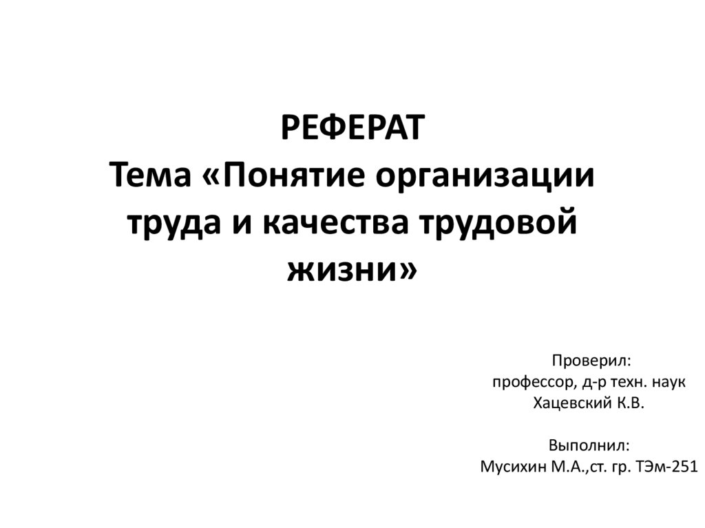 РЕФЕРАТ Тема «Понятие организации труда и качества трудовой жизни»