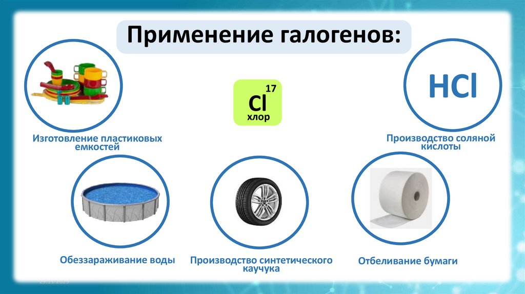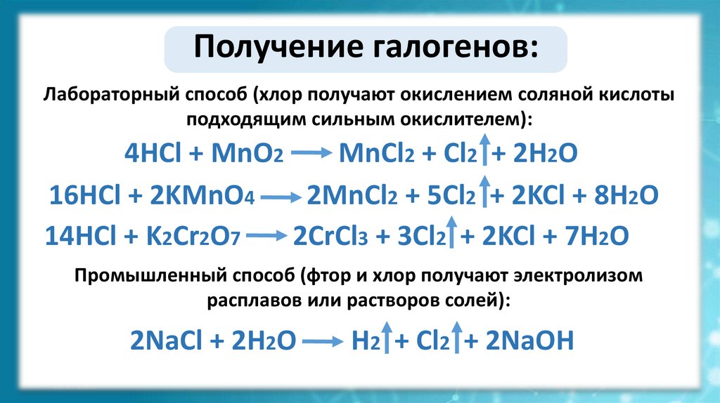 Получение галогенов:Лабораторный способ (хлор получают окислением соляной кислоты
