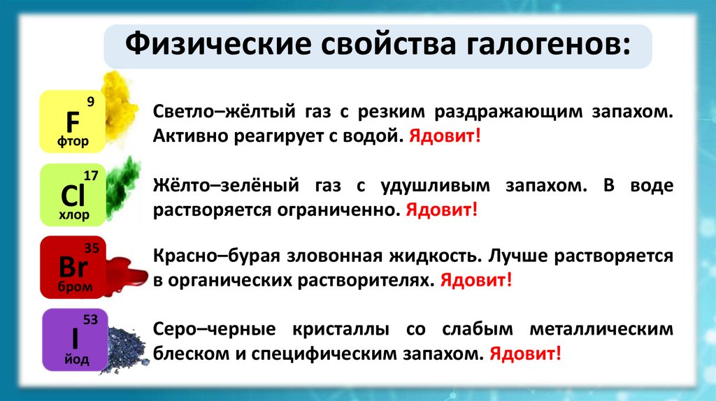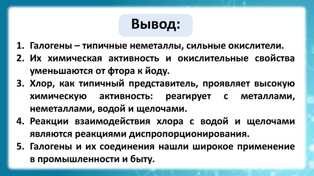 Вывод:1. Галогены – типичные неметаллы, сильные окислители.