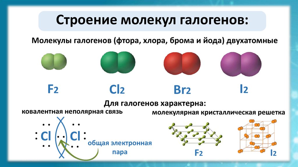 Строение молекул галогенов:Молекулы галогенов (фтора, хлора, брома и йода) двухатомные