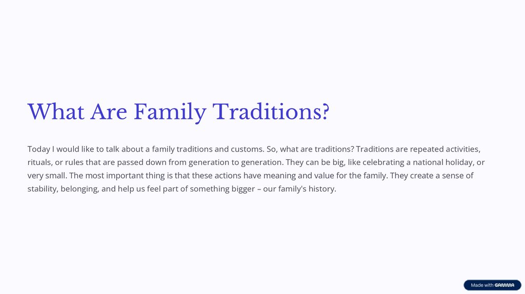 What Are Family Traditions?Today I would like to talk about a family traditions and customs. So, what are traditions? Traditions are repeated activities,