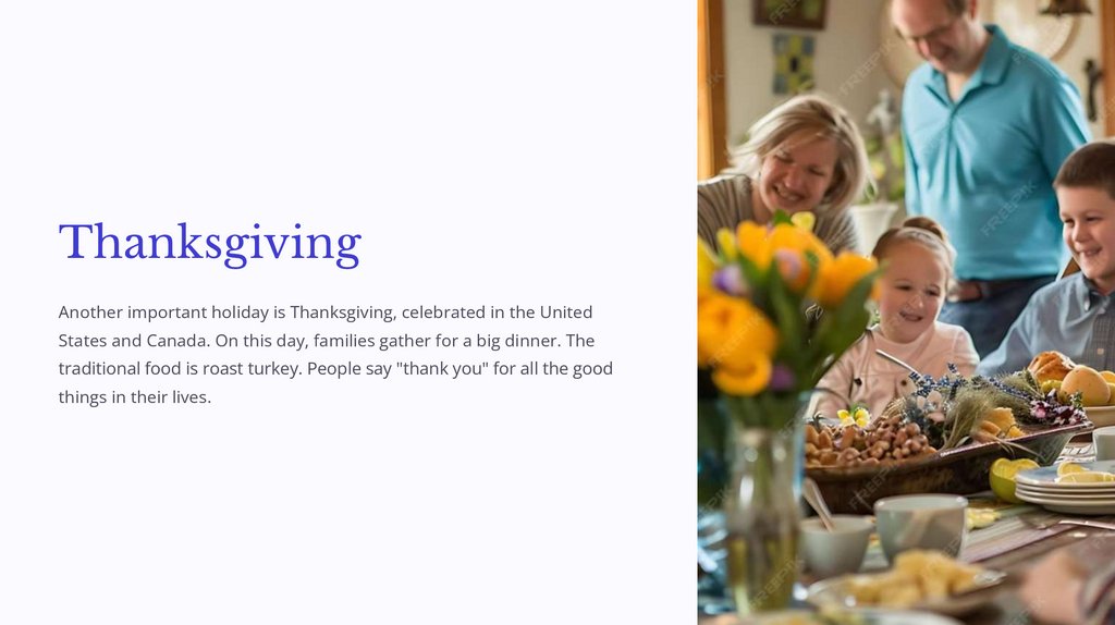 ThanksgivingAnother important holiday is Thanksgiving, celebrated in the United