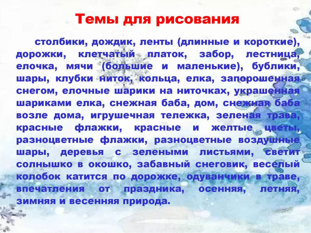 Темы для рисованиястолбики, дождик, ленты (длинные и короткие),