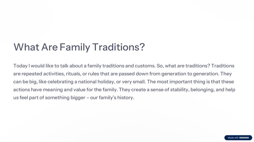 What Are Family Traditions?Today I would like to talk about a family traditions and customs. So, what are traditions? Traditions