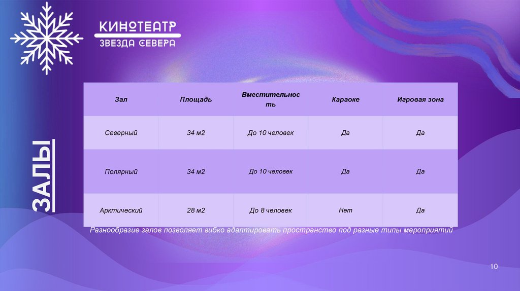 Разнообразие залов позволяет гибко адаптировать пространство под разные типы мероприятий