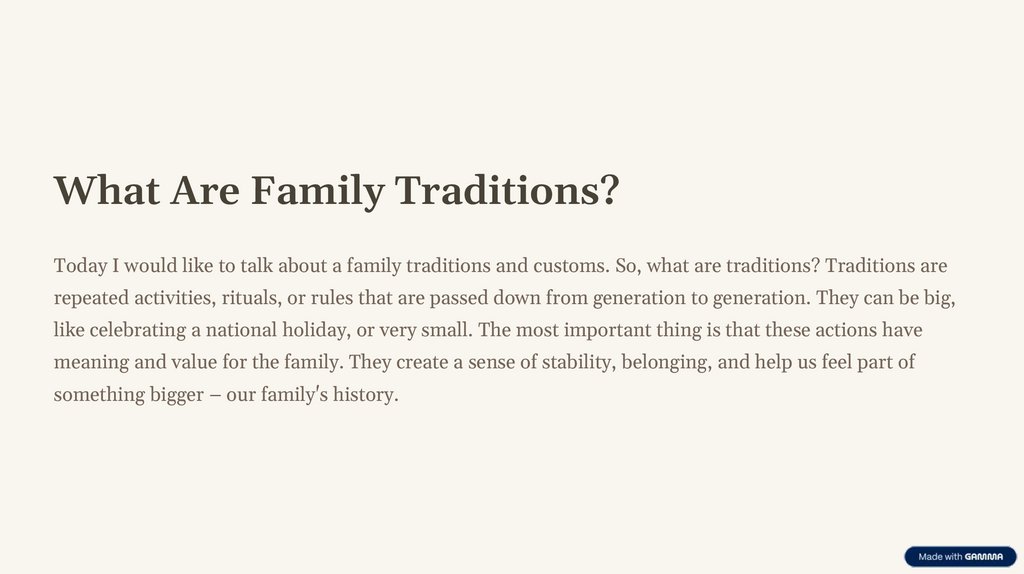 What Are Family Traditions?Today I would like to talk about a family traditions and customs. So, what are traditions? Traditions are