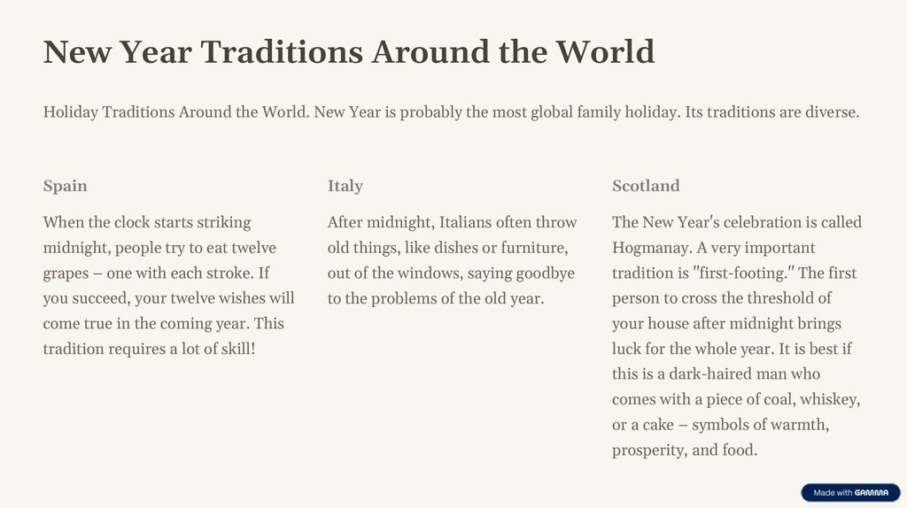 New Year Traditions Around the WorldHoliday Traditions Around the World. New Year is probably the most global family holiday. Its traditions are diverse.