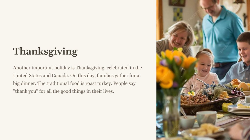 ThanksgivingAnother important holiday is Thanksgiving, celebrated in the