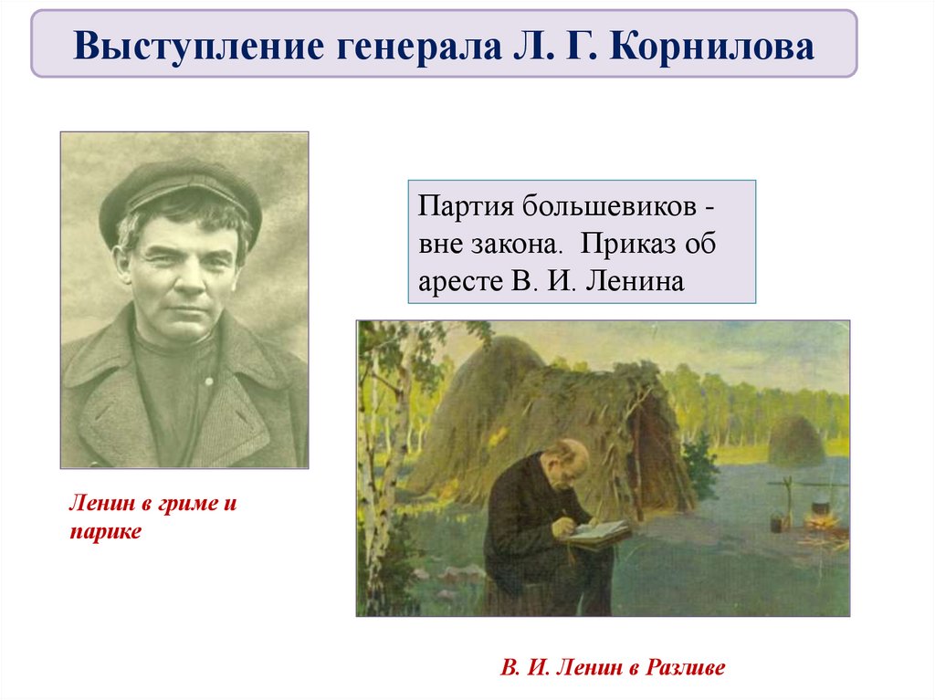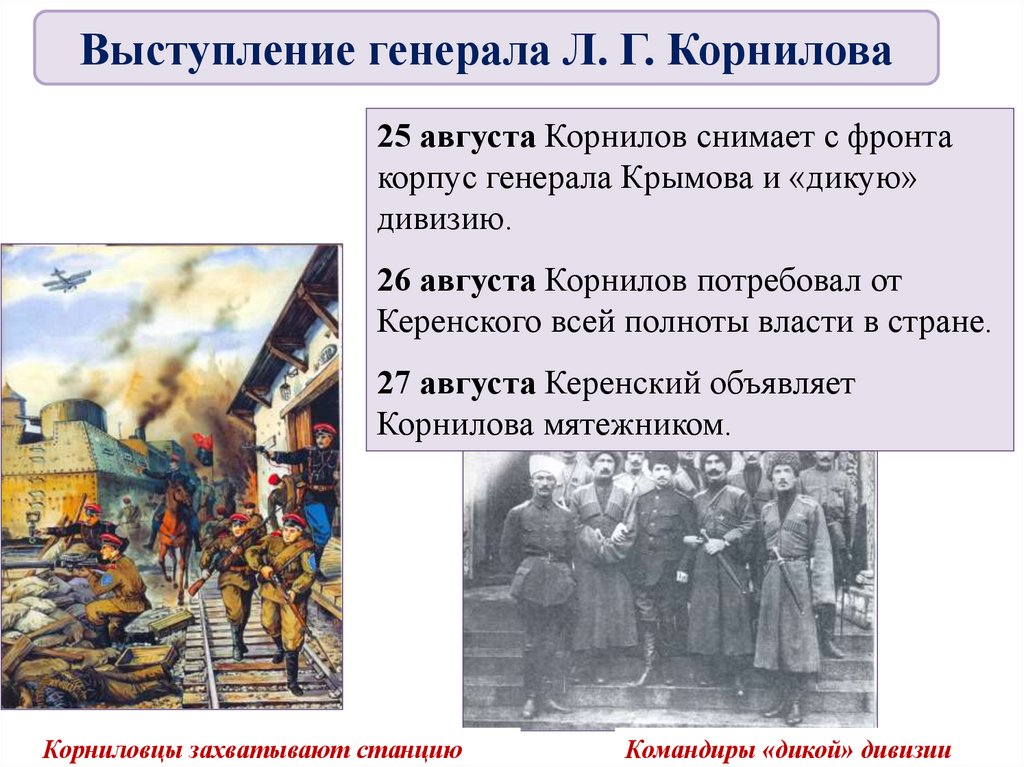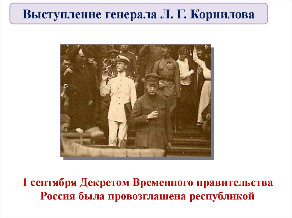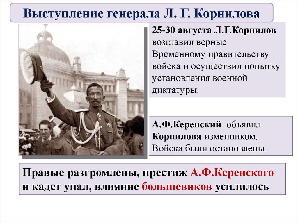 Выступление генерала Л. Г. КорниловаПартия большевиков вне закона. Приказ об