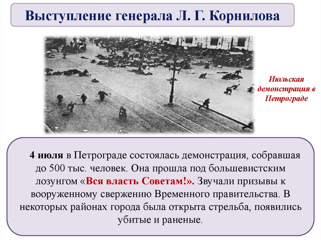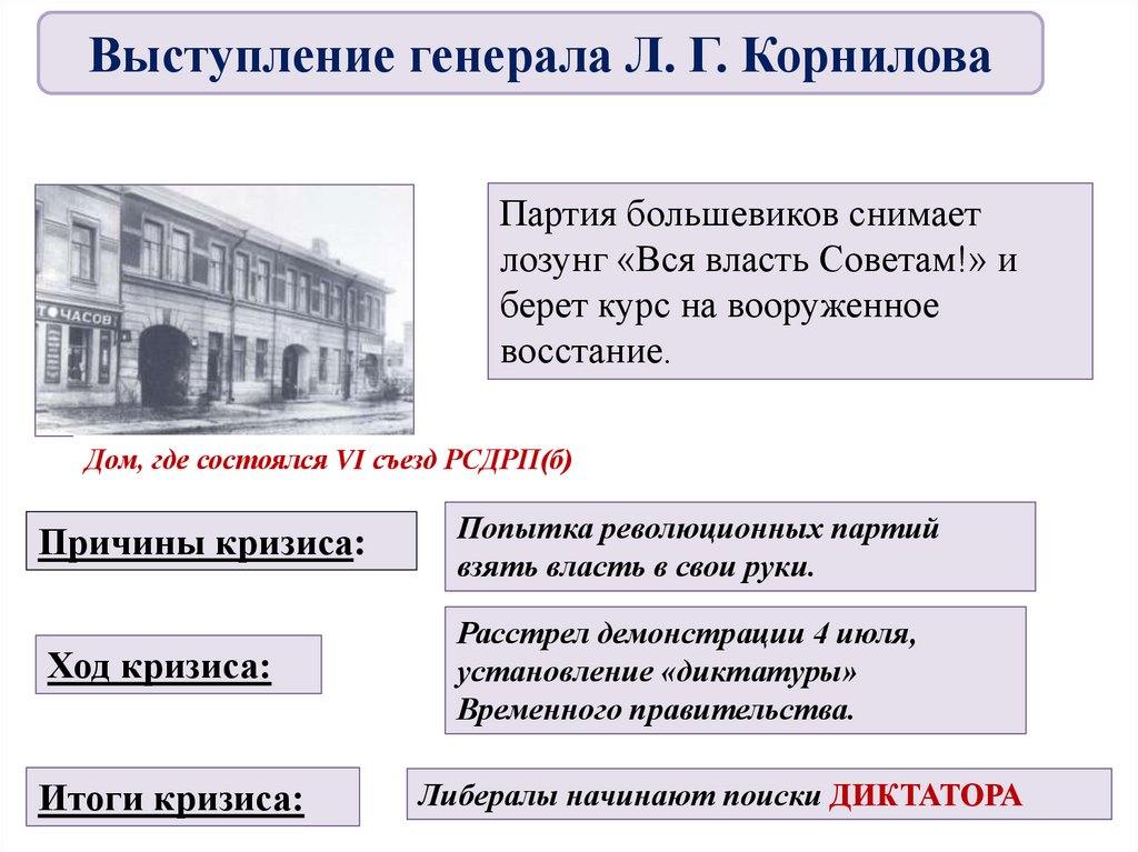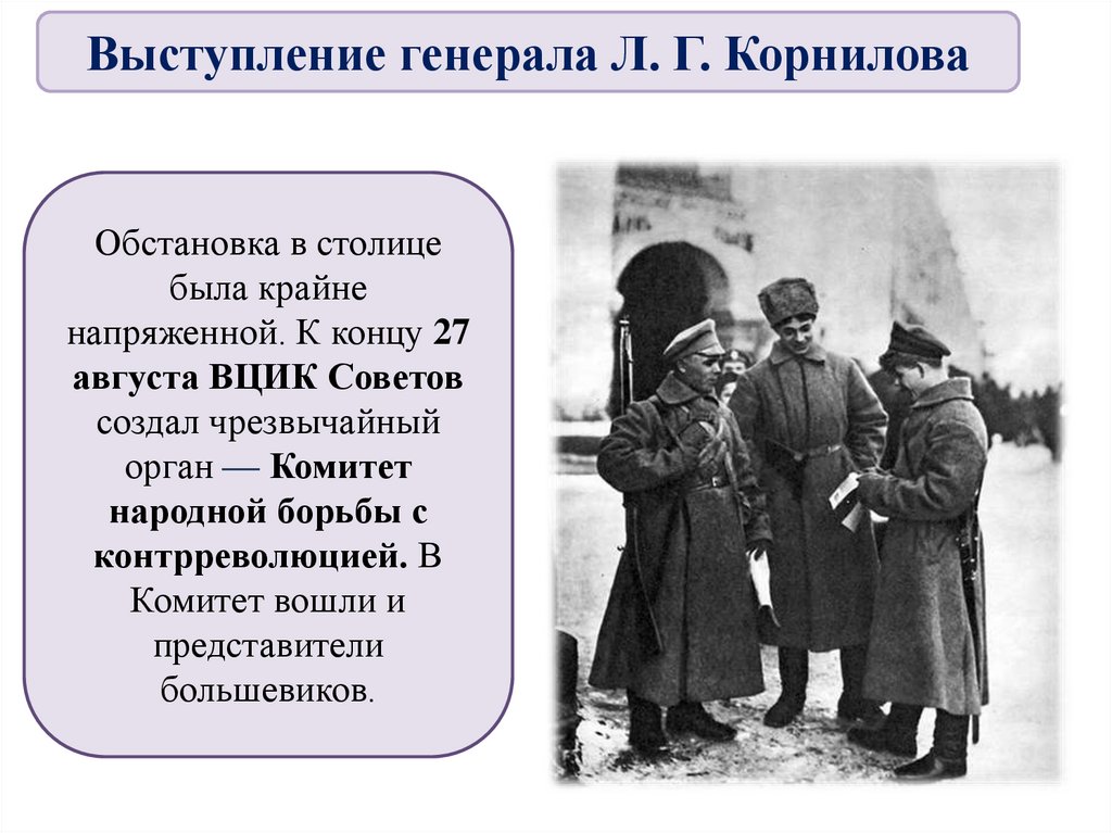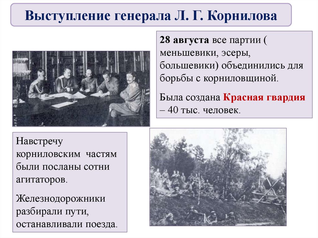 Выступление генерала Л. Г. КорниловаПартия большевиков вне закона. Приказ об