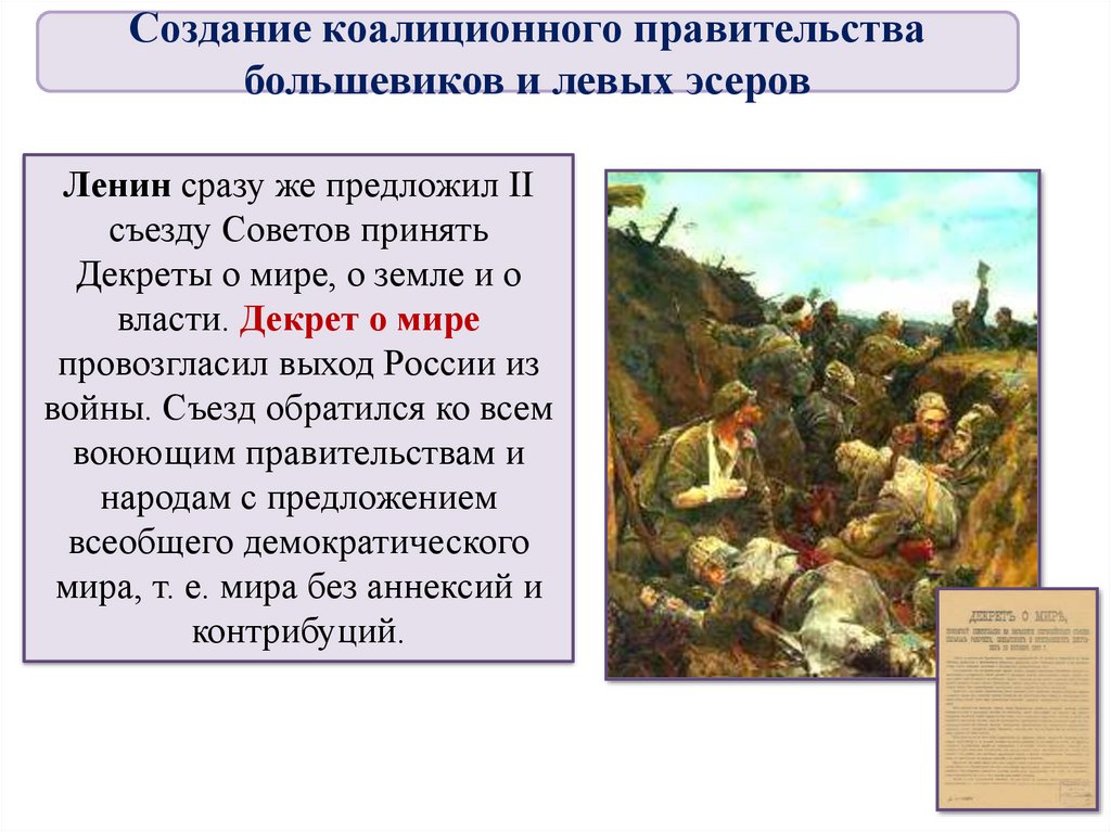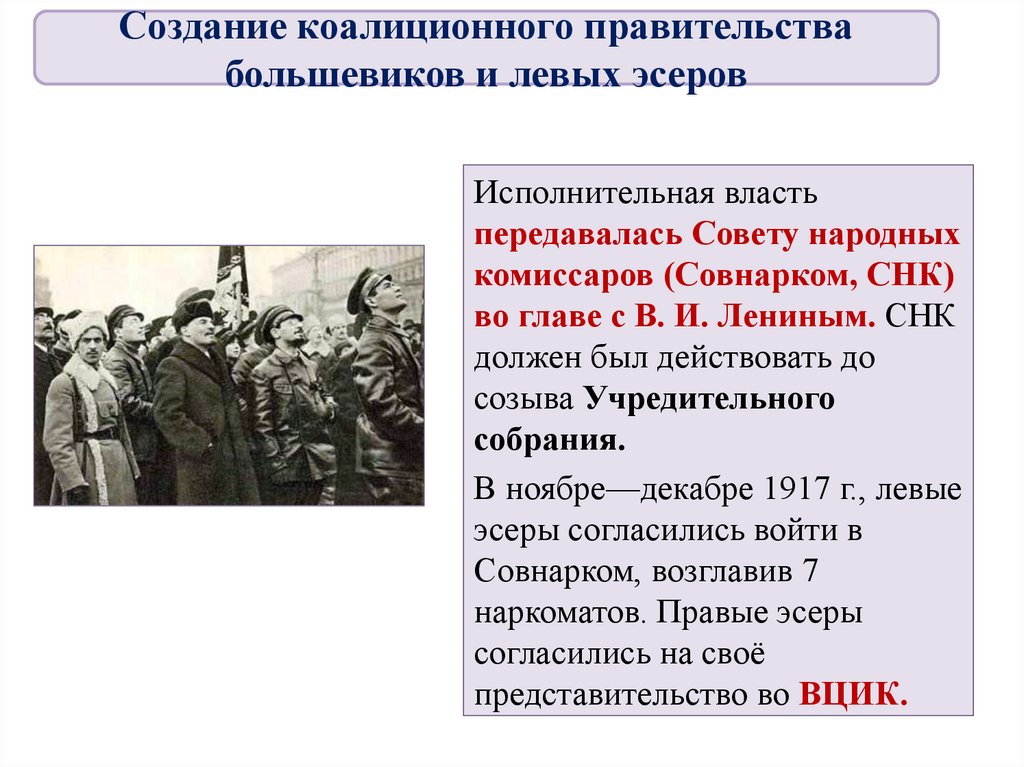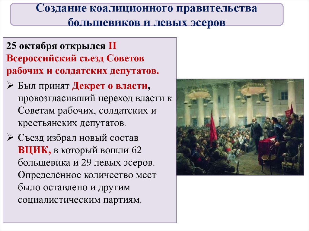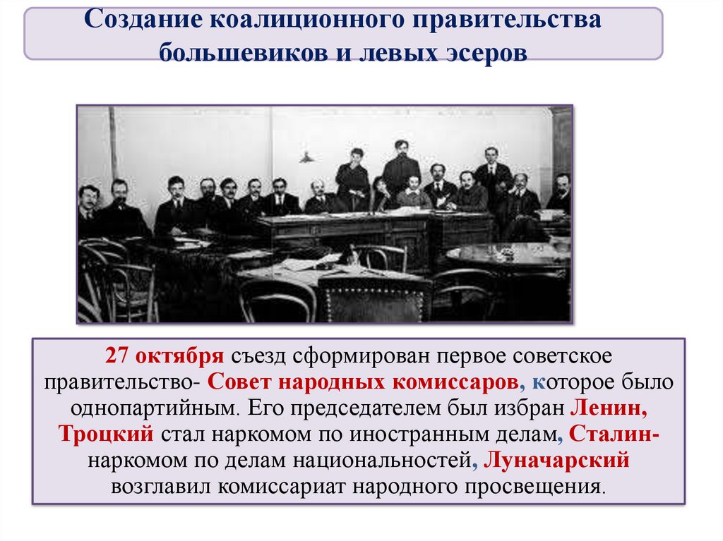 Создание коалиционного правительствабольшевиков и левых эсеров