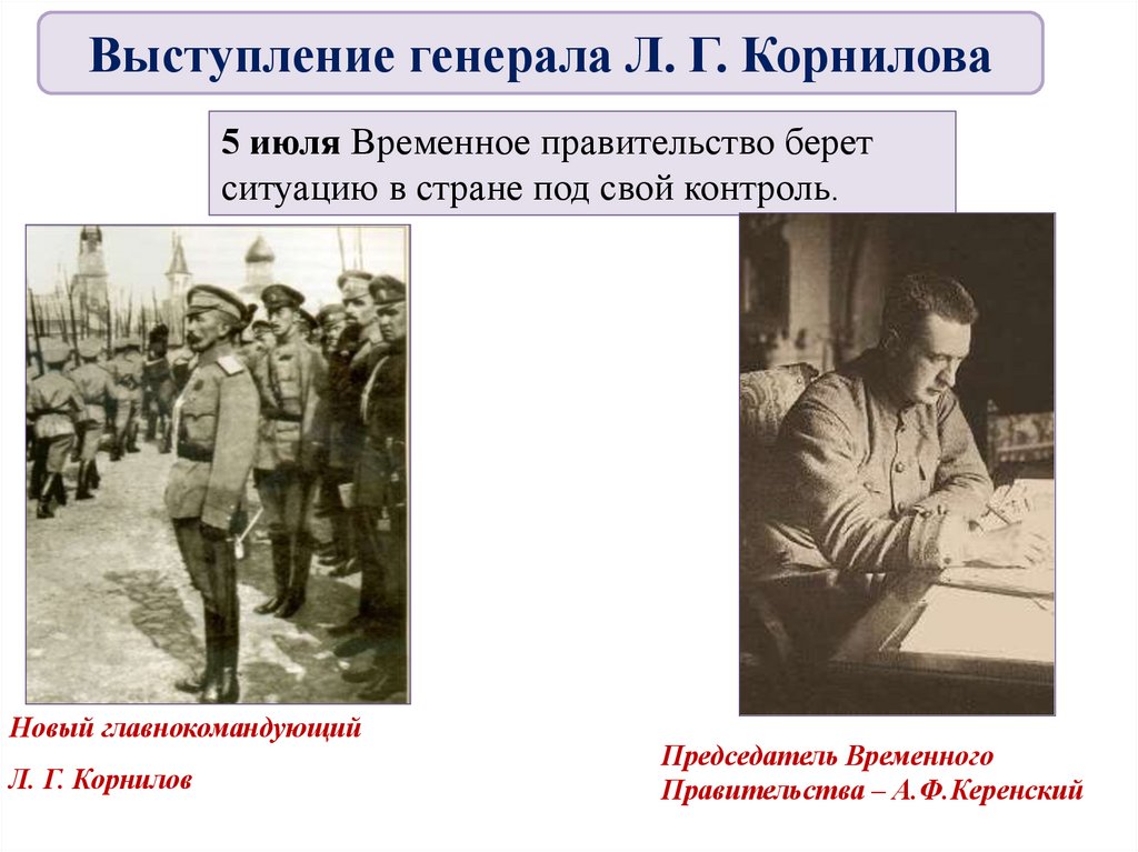 Выступление генерала Л. Г. Корнилова5 июля Временное правительство берет