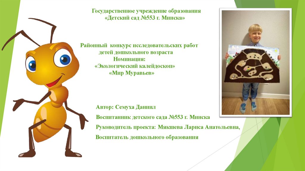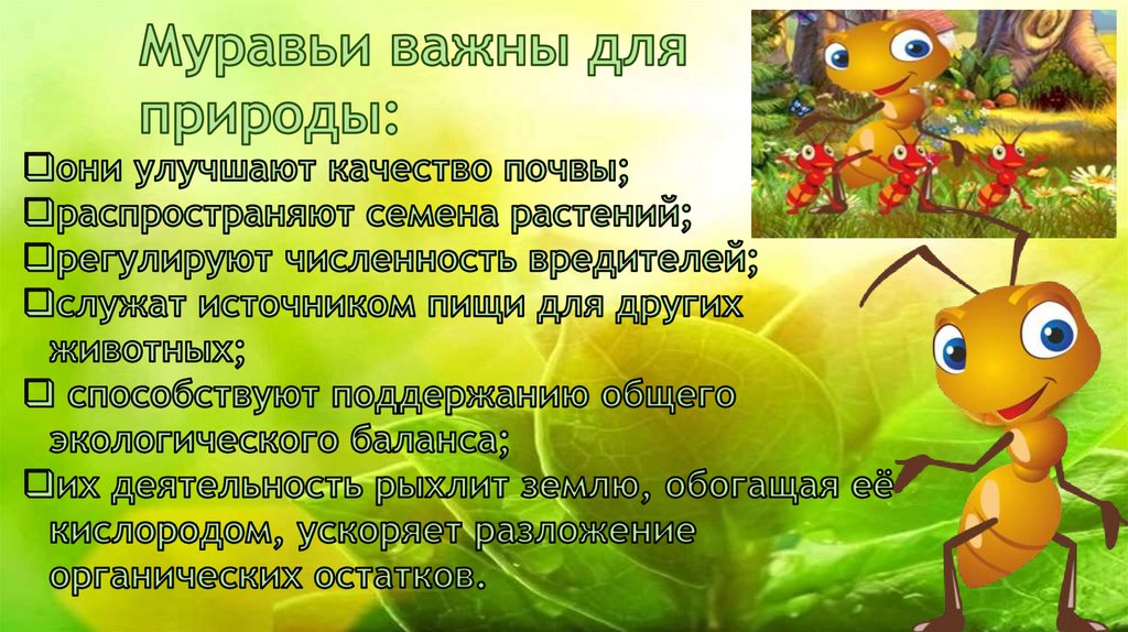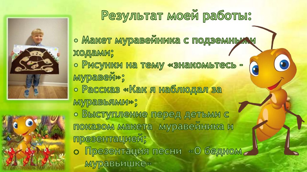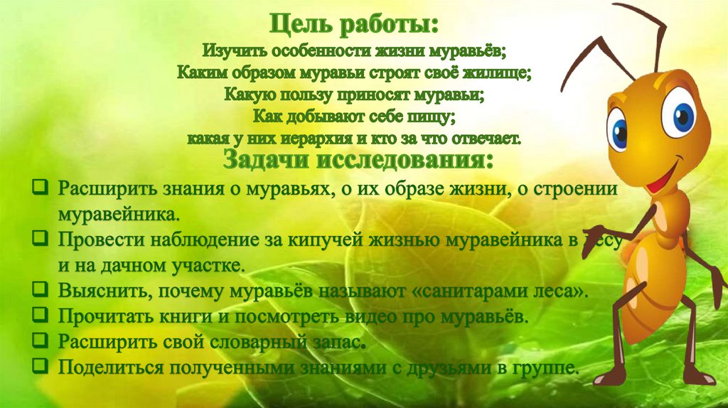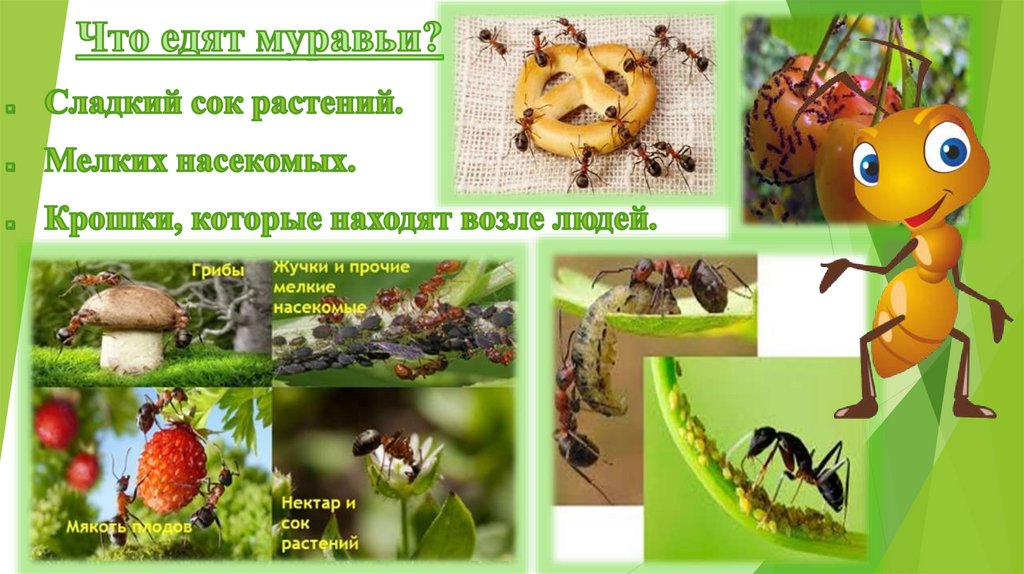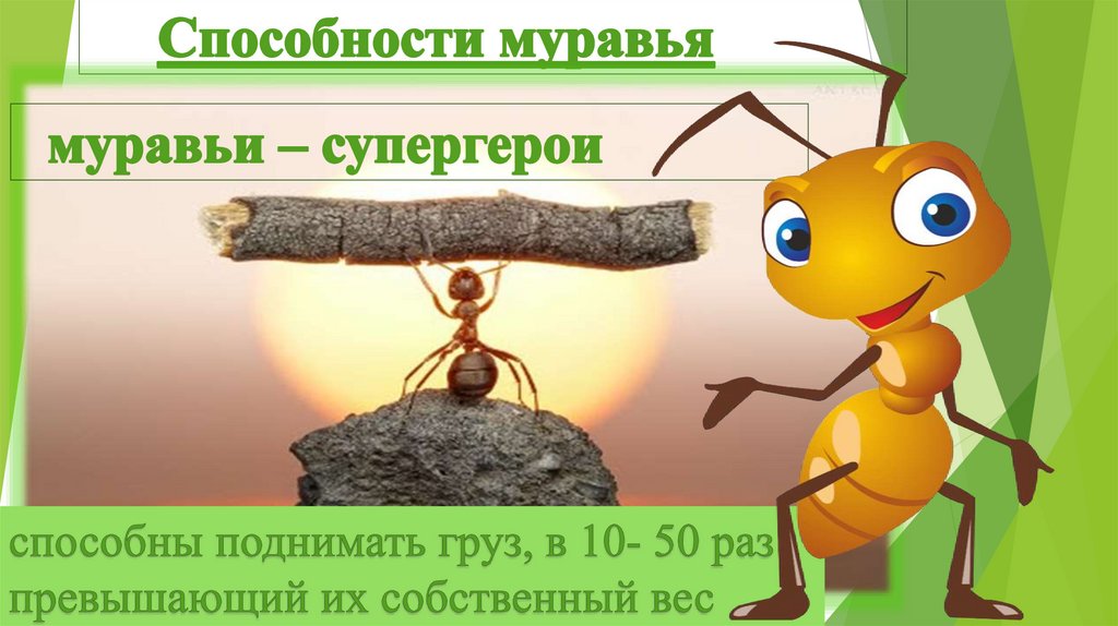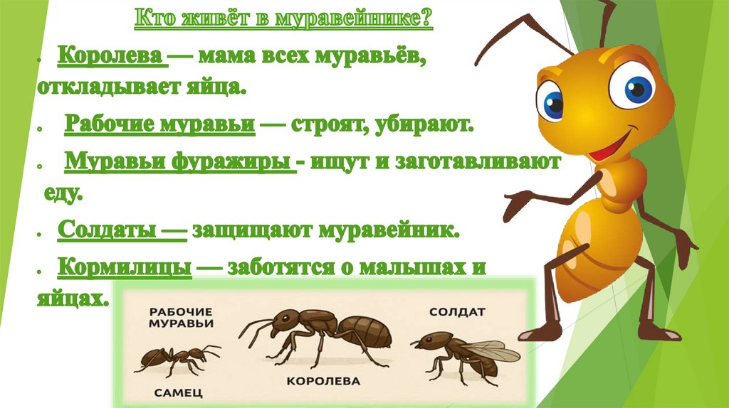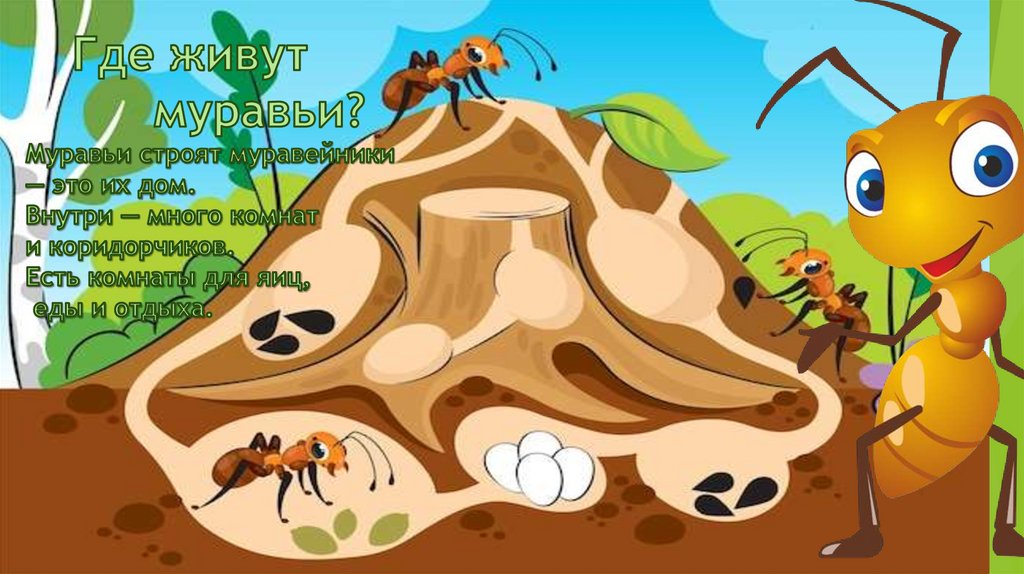 5. Знакомьтесь — муравей! Муравей — это маленькое насекомое, которое имеет следующие части тела: голова; грудь; брюшко; 6 ножек