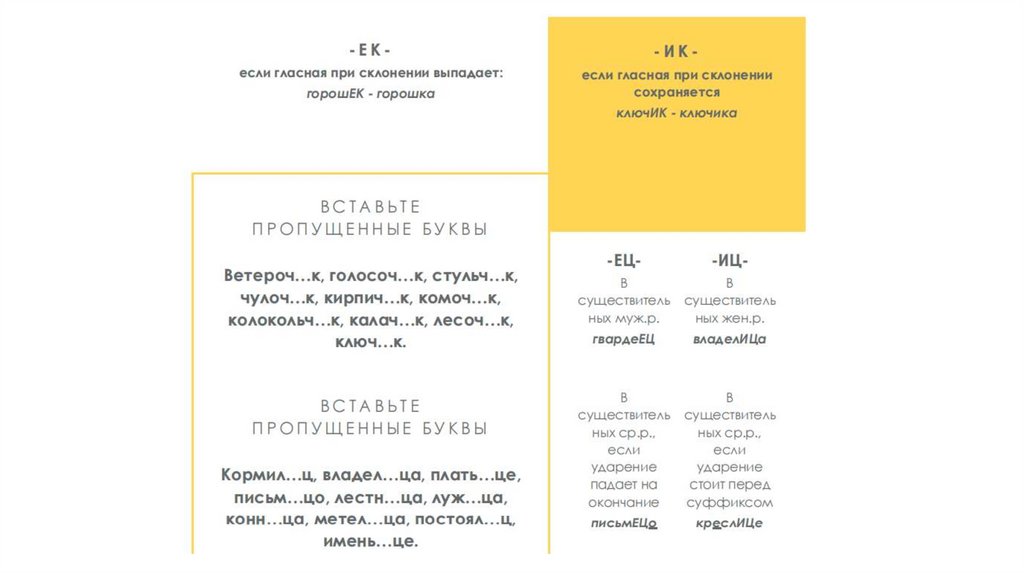 владел..ца, письм..цо, искусн..ца, растень..це, дев..ца, ружь..цо, букет..ц, сестр..ца,