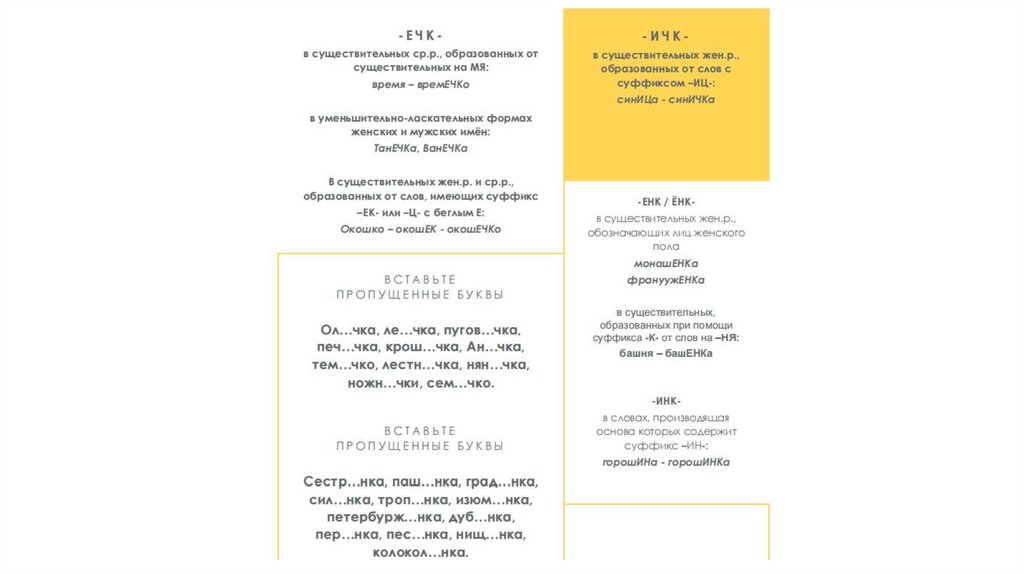 гусен..чка, больш..нство, меньш..нство, питом..ц, солом..нка, француж..нка,