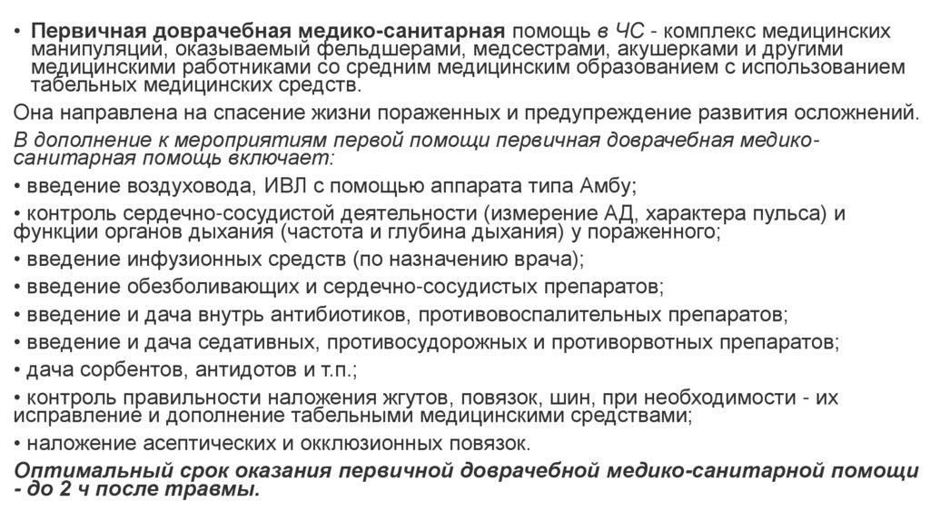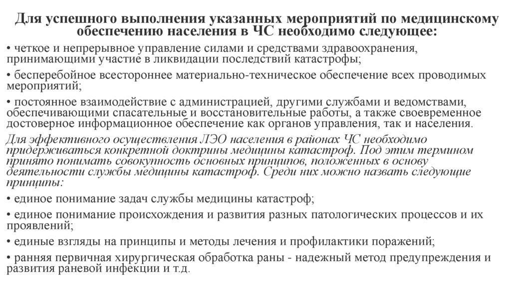 • медицинское обеспечение непораженного населения в районе ЧС;