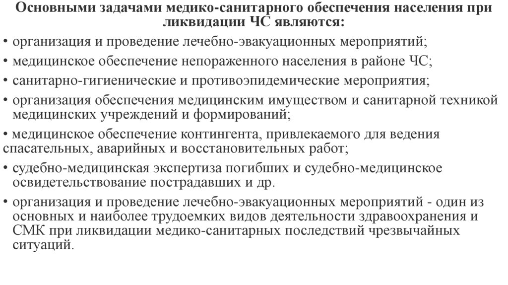 Основными задачами медико-санитарного обеспечения населения приликвидации ЧС являются:
