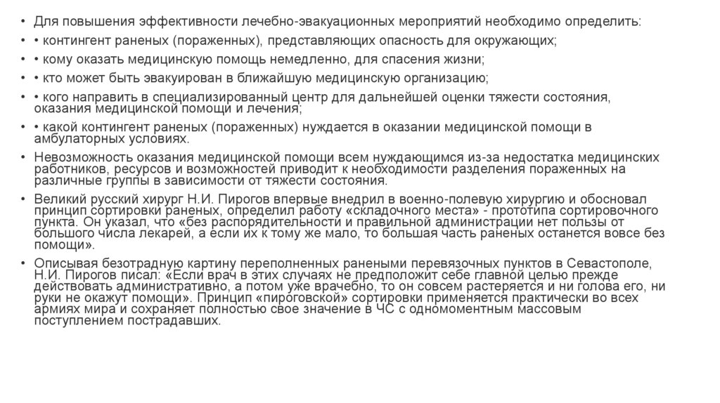 медицинской помощи. «Без диагноза, - пишет Н.И. Пирогов, - немыслима правильная сортировка раненых». В