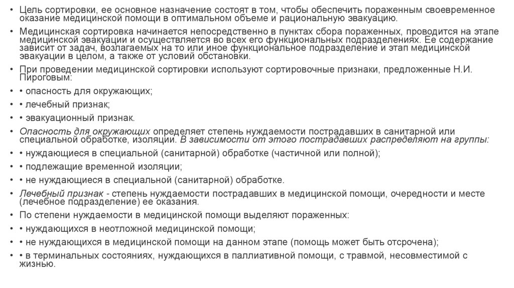 • Цель сортировки, ее основное назначение состоят в том, чтобы обеспечить пораженным своевременноеоказание медицинской помощи в оптимальном объеме и рациональную эвакуацию.