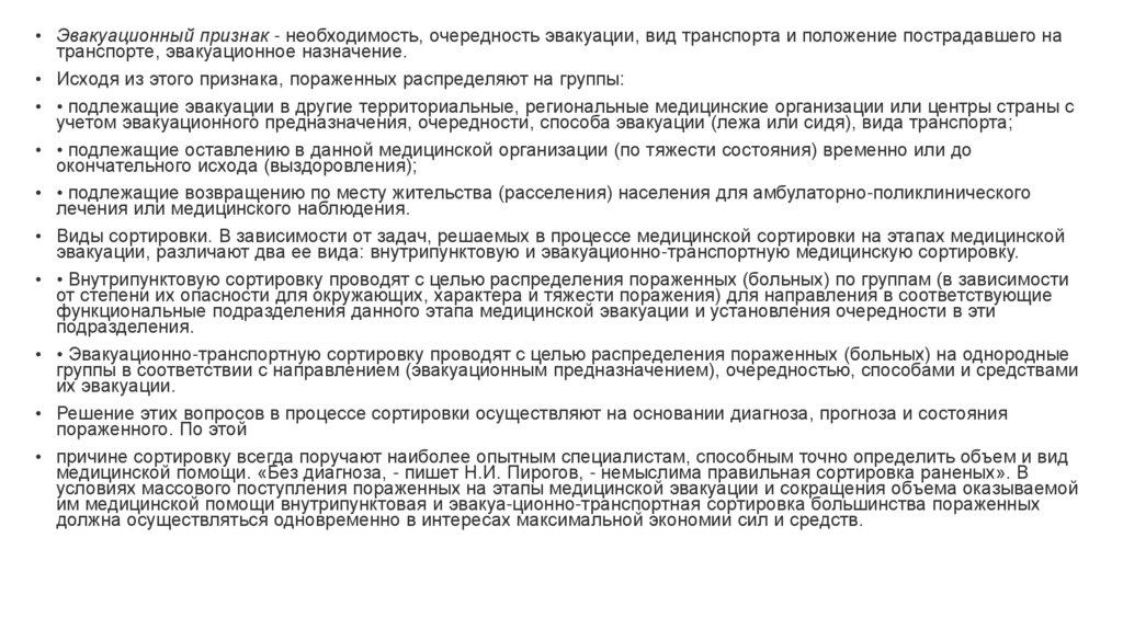 эвакуации, различают два ее вида: внутрипунктовую и эвакуационно-транспортную медицинскую сортировку.