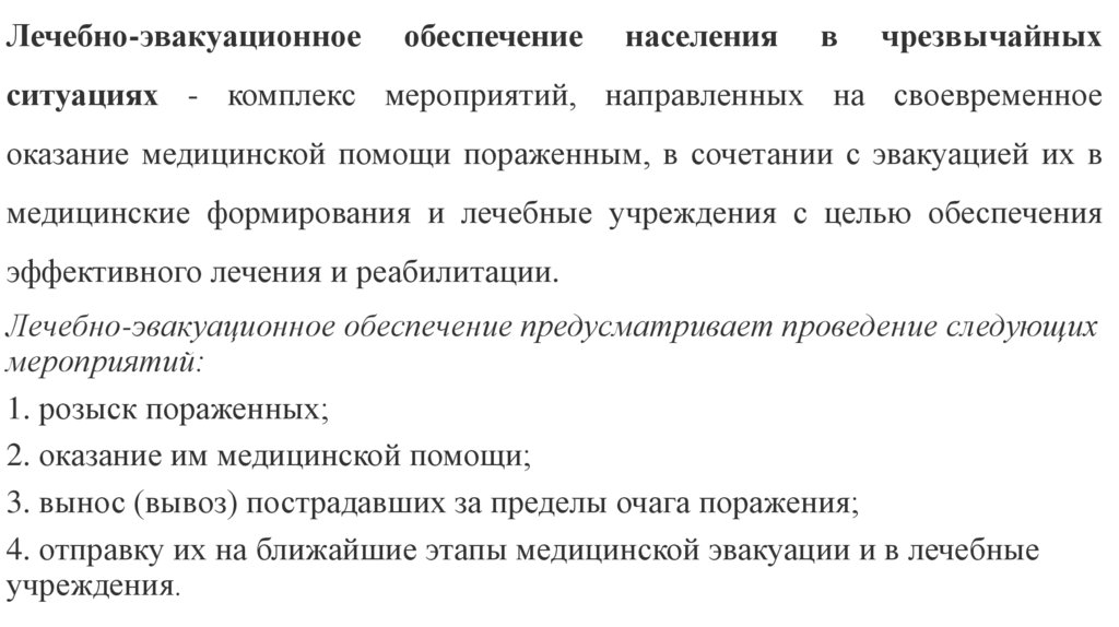 Лечебно-эвакуационное обеспечение предусматривает проведение следующих