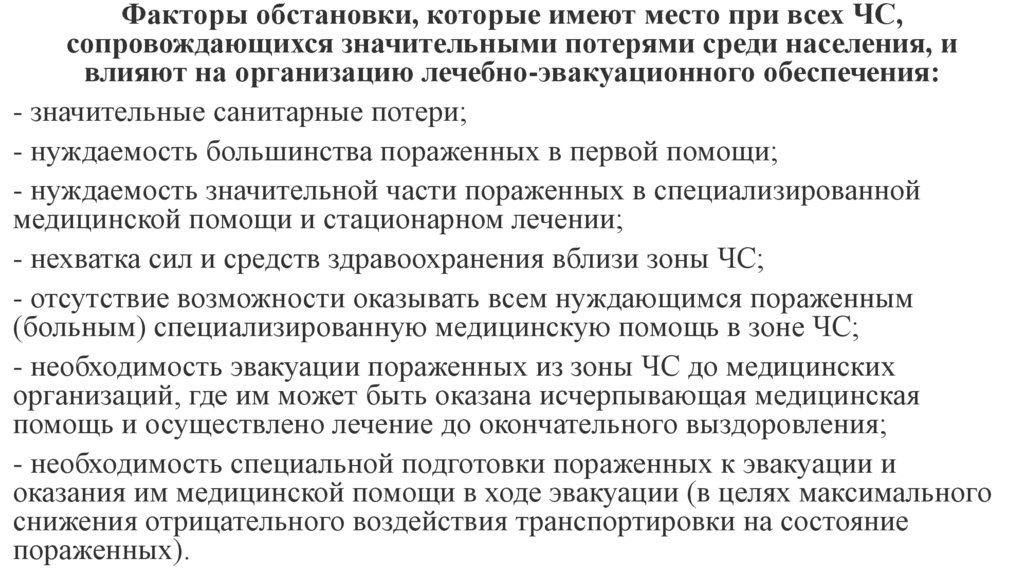 - необходимость эвакуации пораженных из зоны ЧС до медицинских