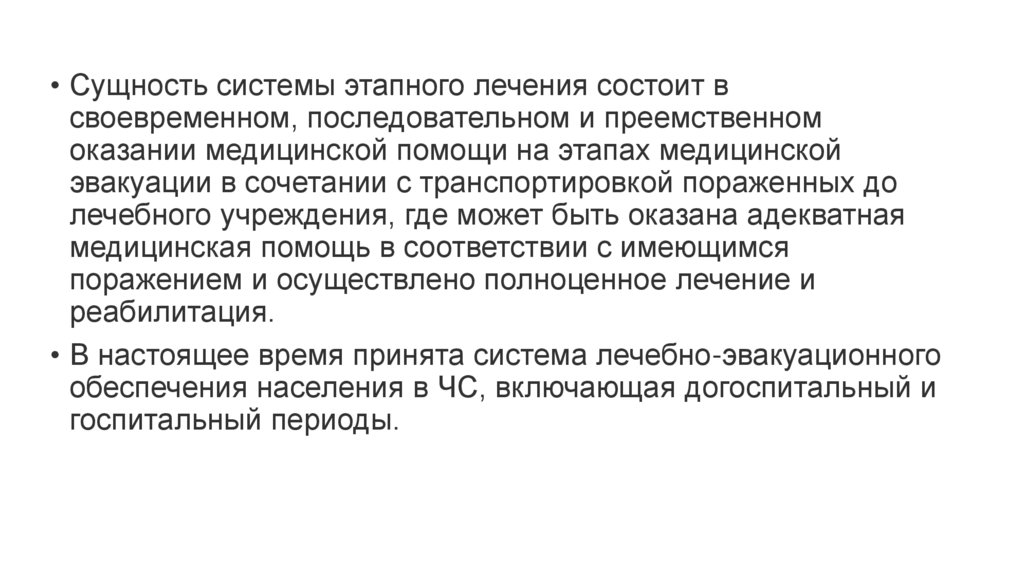 • Сущность системы этапного лечения состоит всвоевременном, последовательном и преемственном