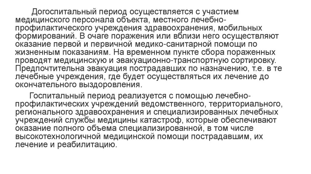 Госпитальный период реализуется с помощью лечебнопрофилактических учреждений ведомственного, территориального,