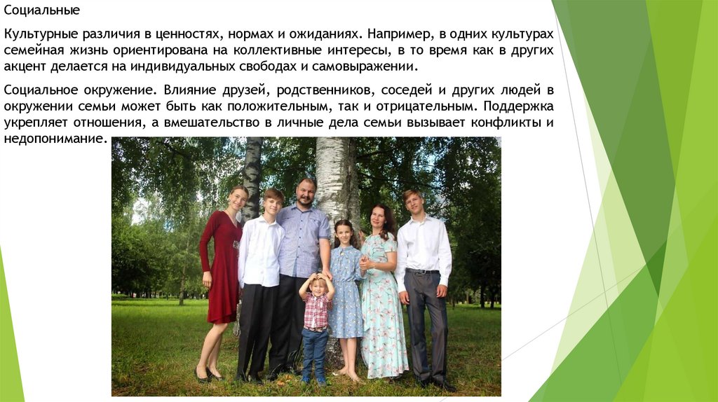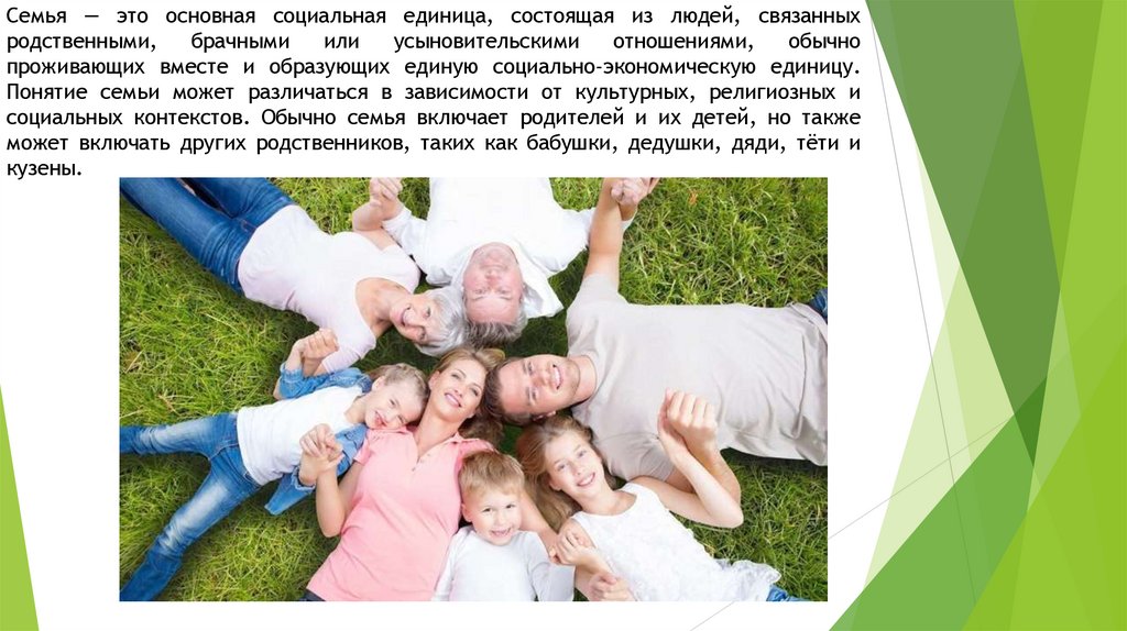 социальных контекстов. Обычно семья включает родителей и их детей, но также
