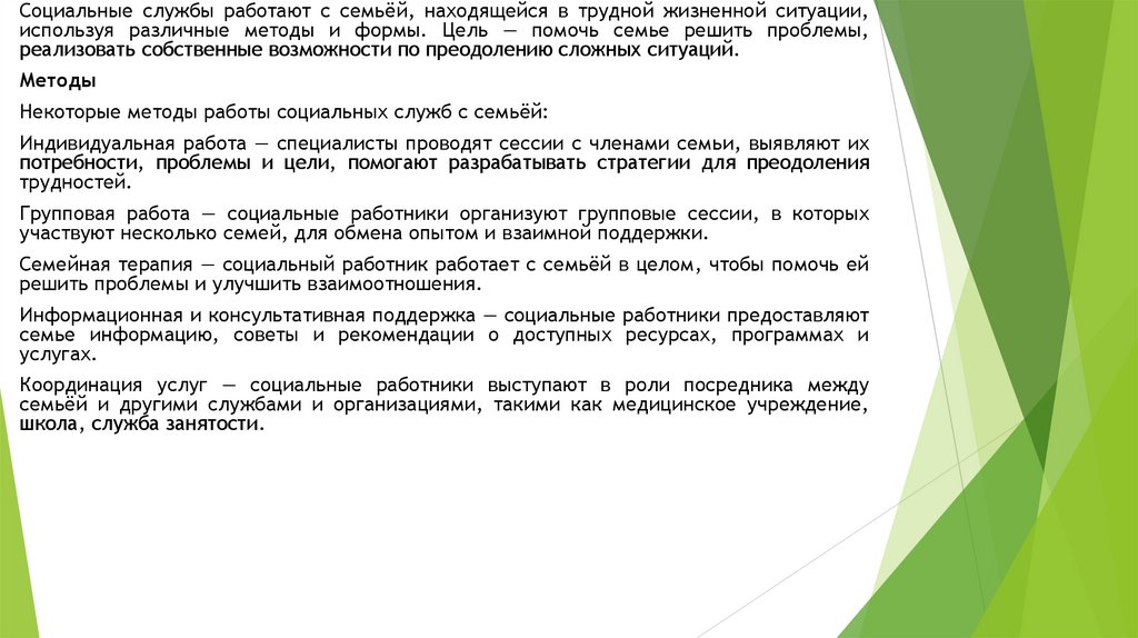 Социальные службы работают с семьёй, находящейся в трудной жизненной ситуации,используя различные методы и формы. Цель — помочь семье решить проблемы,