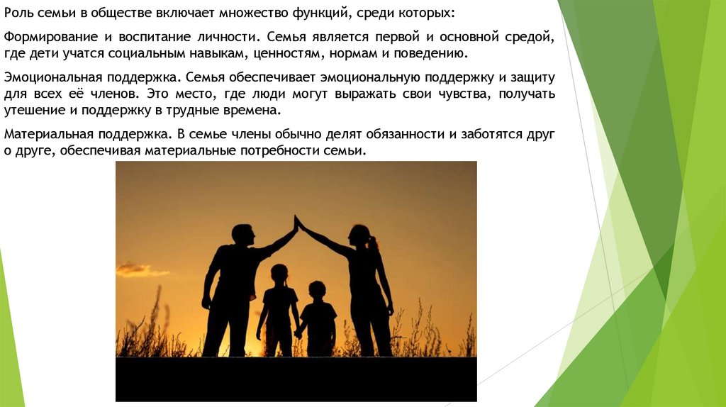 Роль семьи в обществе включает множество функций, среди которых:Формирование и воспитание личности. Семья является первой и основной средой,