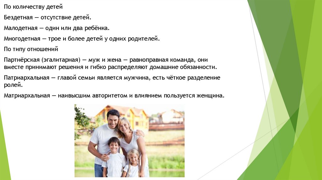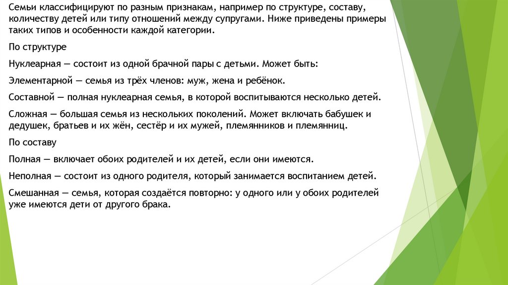 Семьи классифицируют по разным признакам, например по структуре, составу,количеству детей или типу отношений между супругами. Ниже приведены примеры