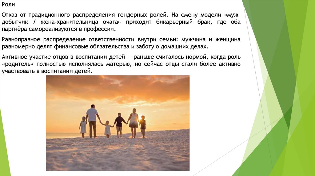РолиОтказ от традиционного распределения гендерных ролей. На смену модели «муждобытчик / жена-хранительница очага» приходит бикарьерный брак, где оба