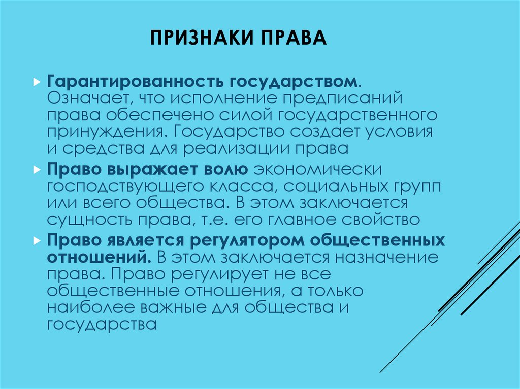 ПРИЗНАКИ ПРАВАГарантированность государством.