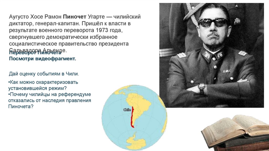 Аугусто Хосе Рамон Пиночет Угарте — чилийскийдиктатор, генерал-капитан. Пришёл к власти в