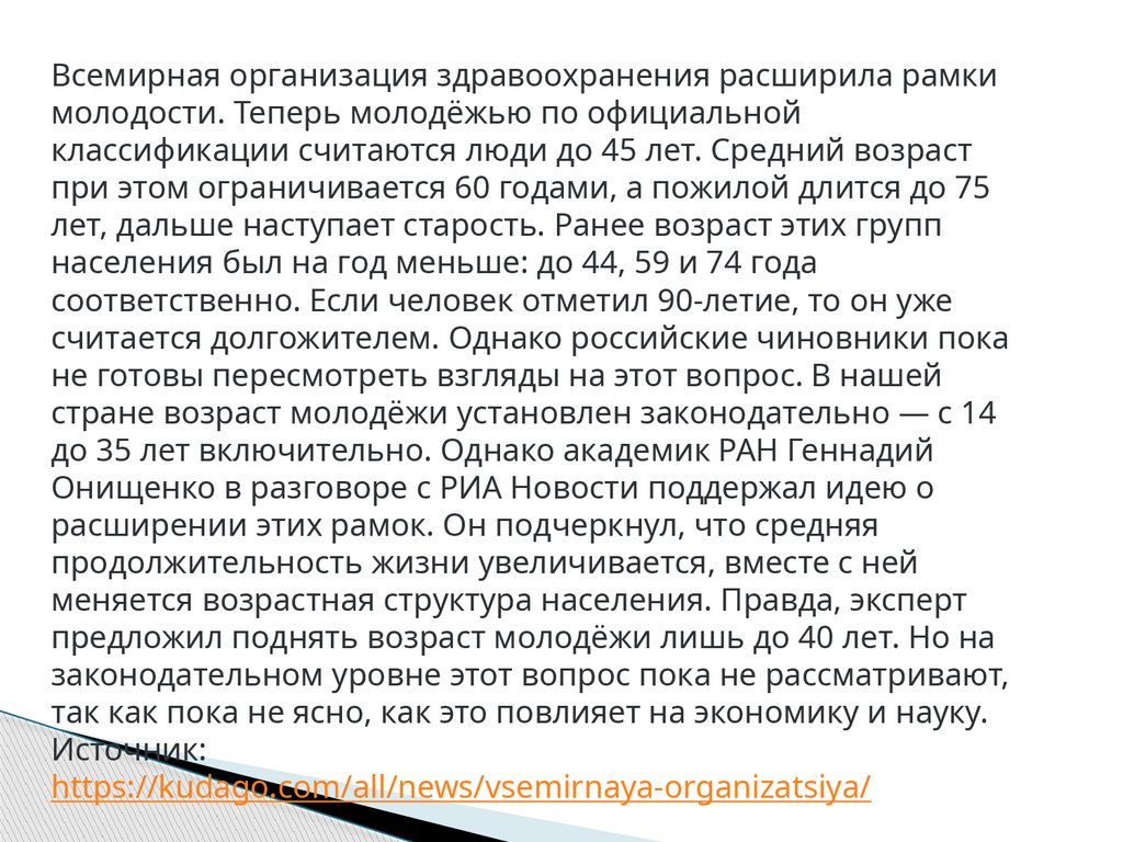 Всемирная организация здравоохранения расширила рамкимолодости. Теперь молодёжью по официальной