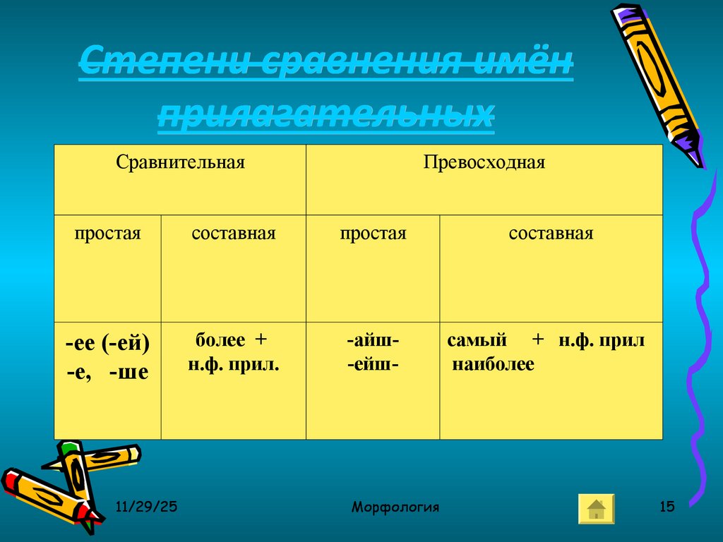 (степень сравнения (если есть), полная или краткая форма, род, число,
