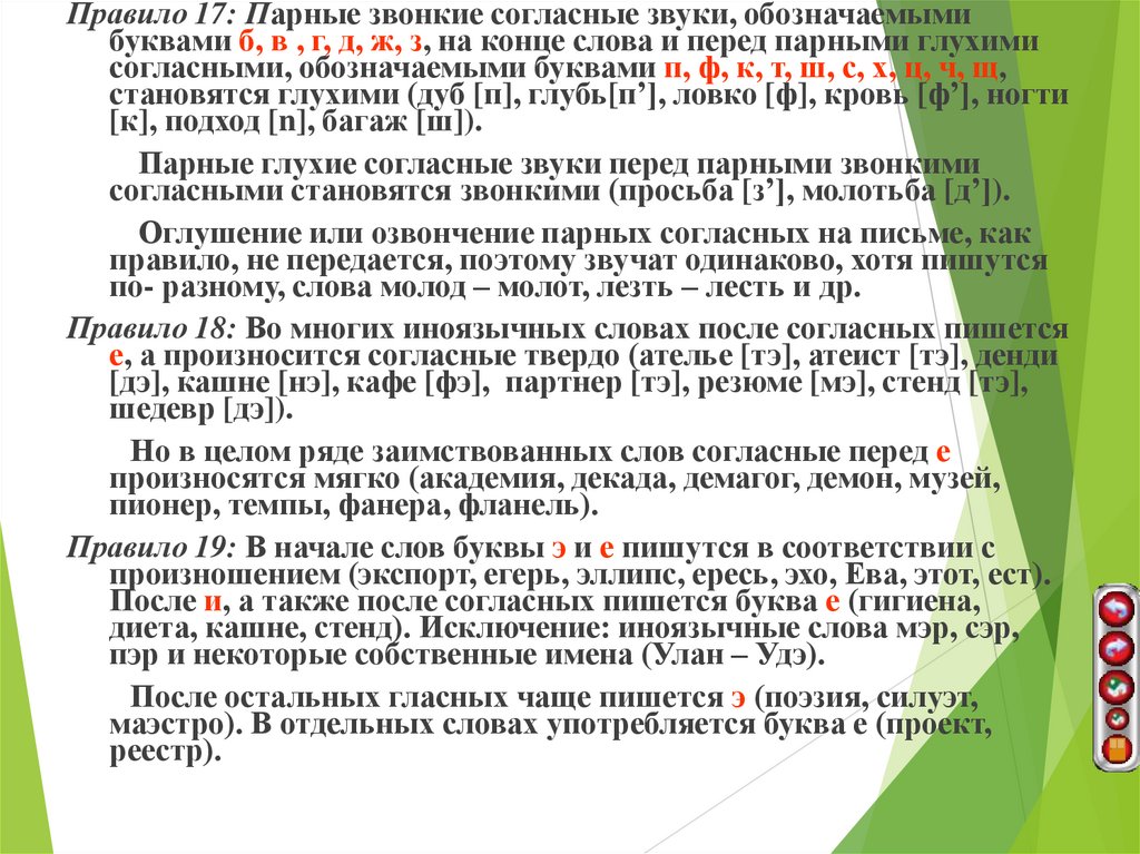 Правило 17: Парные звонкие согласные звуки, обозначаемымибуквами б, в , г, д, ж, з, на конце слова и перед парными глухими