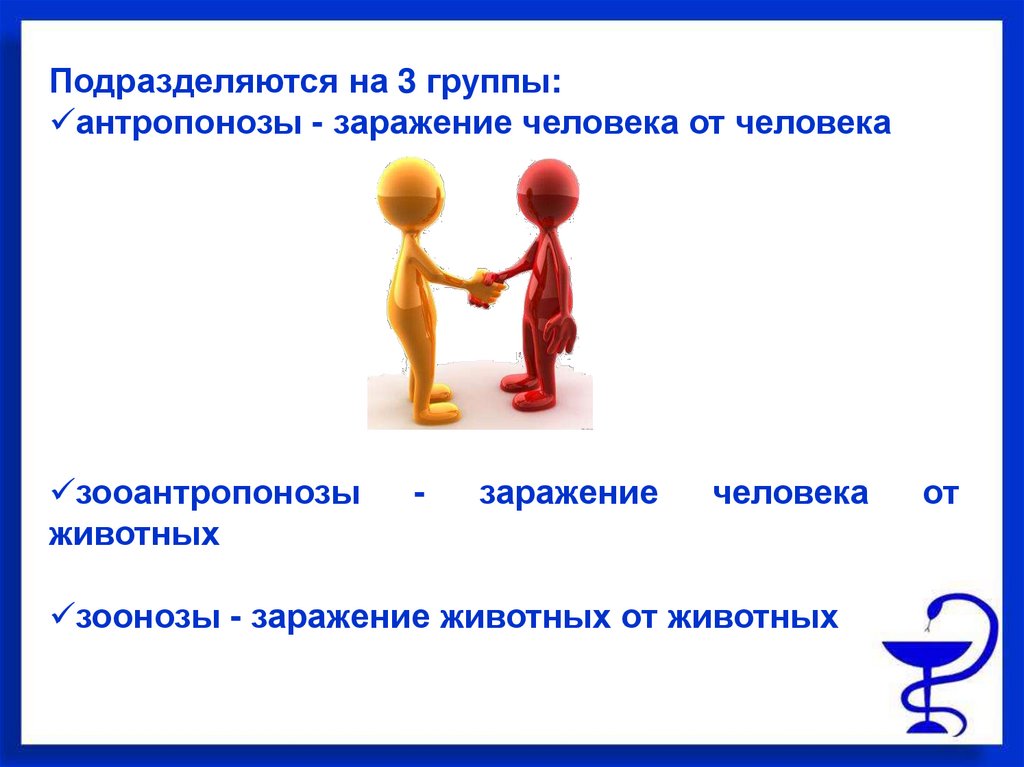 Подразделяются на 3 группы:антропонозы - заражение человека от человека