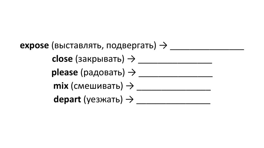 expose (выставлять, подвергать) → _______________close (закрывать) → _______________