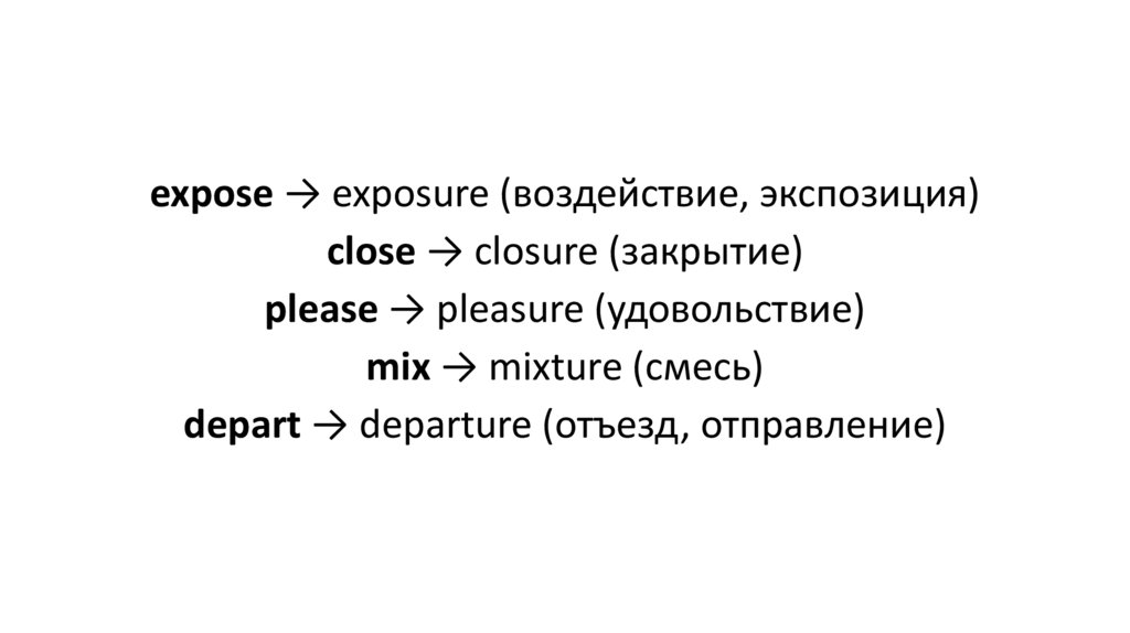 expose → exposure (воздействие, экспозиция)close → closure (закрытие)