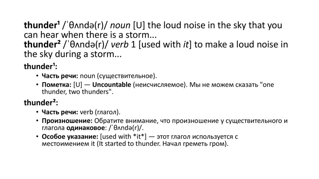 thunder¹ /ˈθʌndə(r)/ noun [U] the loud noise in the sky that youcan hear when there is a storm...