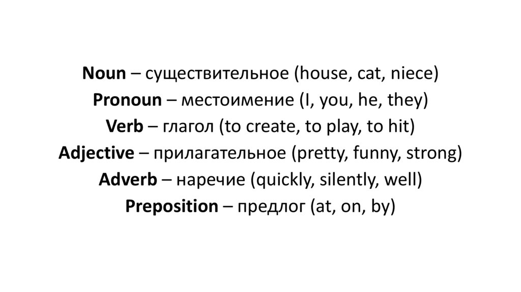 Noun – существительное (house, cat, niece)Pronoun – местоимение (I, you, he, they)