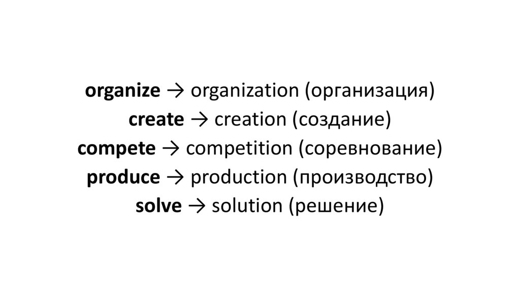 Часто добавляется к глаголам, оканчивающимся на -ate, -ute, ize/se, -ain, -orm.Примеры: