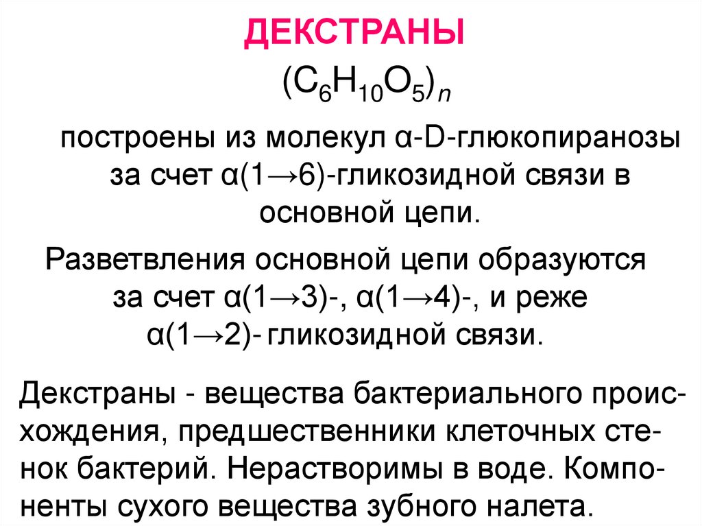 Декстраны - вещества бактериального происхождения, предшественники клеточных стенок бактерий. Нерастворимы в воде. Компоненты сухого вещества зубного налета.