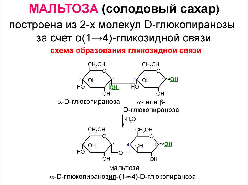 МАЛЬТОЗА (солодовый сахар)построена из 2-х молекул D-глюкопиранозы